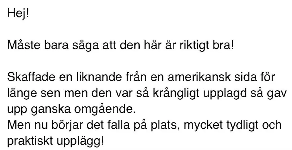 "Så himla smart med allt på ett ställe. Gillar speciellt att jag kommer åt det jag behöver göra under veckan utifrån de 90- dagarsmål jag jag satt. Det här gör att jag gör rätt saker och håller fokus. För allting hör ju ju ihop och det är det som är så lätt att glömma. Tack dorro för en bra mall!"